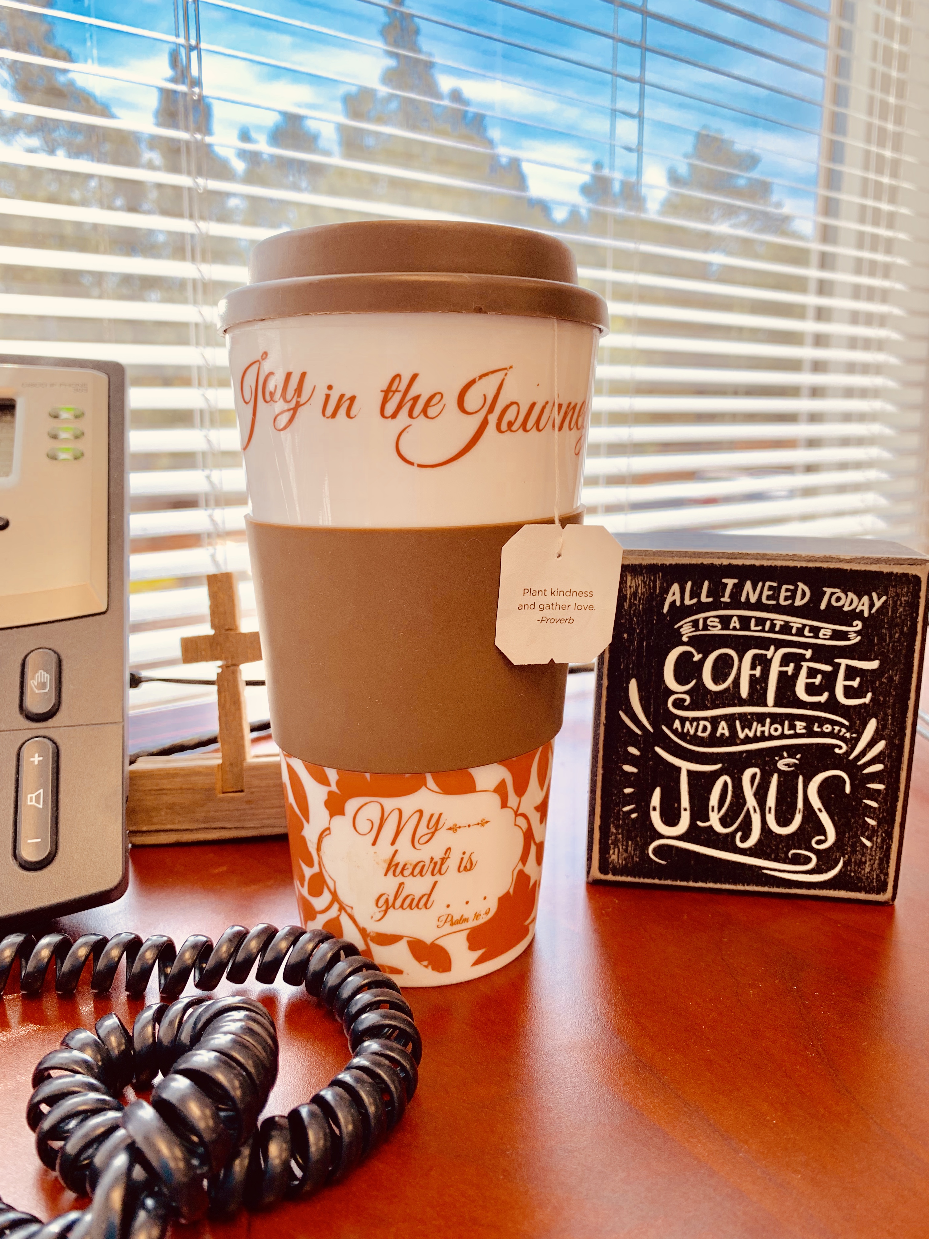 Isn’t this a pretty image of an inspirational cup full of tea proclaiming a sweet message of loving kindness? I don’t usually drink tea, but this particular herbal tea was much needed for its special ingredient. I’m more of a Jesus and coffee kind of girl, thus the sign on my desk.