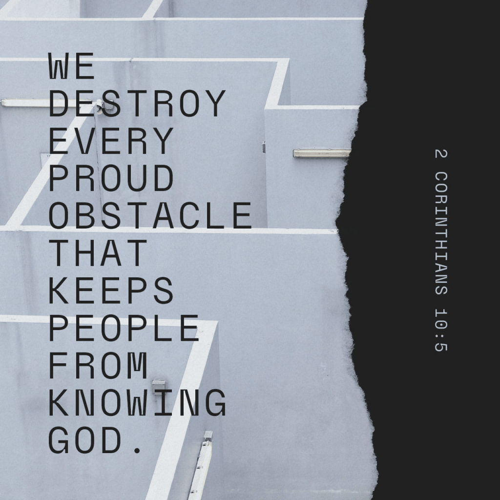 “For though we walk in the flesh [as mortal men], we are not carrying on our [spiritual] warfare according to the flesh and using the weapons of man. The weapons of our warfare are not physical [weapons of flesh and blood]. Our weapons are divinely powerful for the destruction of fortresses. We are destroying sophisticated arguments and every exalted and proud thing that sets itself up against the [true] knowledge of God, and we are taking every thought and purpose captive to the obedience of Christ,”